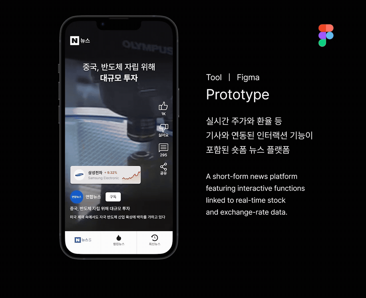 ‘네이버 뉴스 S’는 포털 뉴스의 텍스트 중심 구조를 시각 정보 중심으로 재구성한 인터랙티브 인포그래픽 뉴스 플랫폼이다. 기존 기사 형식을 유지하되, 주가 그래프·검색 트렌드·연관 데이터 등 뉴스를 시각적으로 연결하여 뉴스를 ‘읽는 것’에서 ‘경험하는 것’으로 확장한다. 사용자는 숏폼의 메인 인터랙션인 스와이프로 최신 이슈를 탐색하고, 기사 속 데이터를 인포그래픽 형태로 직관적으로 이해할 수 있다. 이는 글로벌 숏폼 플랫폼에 빼앗긴 뉴스 이용자들을 다시 국내로 연결할 수 있는 새로운 뉴스 UX·UI를 제안한다.